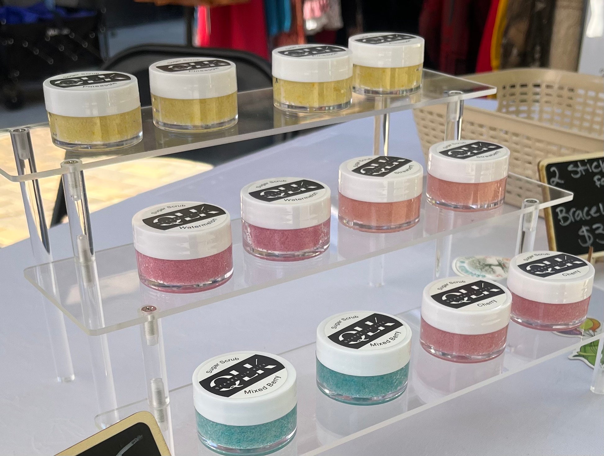 Pure Sugar Cane, Bees wax, essential oil, vitamin E oil, Jojoba oil, Food grade dye